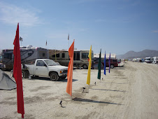 We finally arrive at our "home," our campsite we will share with 14 other men. Peter has designed an elaborate canopy to drape from our RV to his and Ed's RV. An additional canvas structure complete with drapes, tables, and flag will enclose the rear of our site. We will be open only to the street we are on - called Kinship. We spend the next several hours helping to create these shelters and two others. These shelters will help us by providing shade and some protection from the dust. Photos.