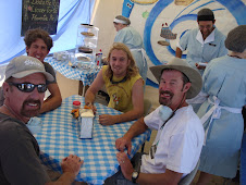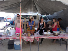 Black Rock City is huge. So big it is the fourth largest city in Nevada during that week. A bicycle is pretty much necessary to travel around. We brought our mountain bikes and went to a campsite called "Pimp Your Bike," where the campers there gave out free items to decorate bikes. We came across a 26 year old man dressed in army uniform and helmet riding a bike. Attached to the handlebars was the engine for a weed wacker. Attached to the weed wacker engine was a blender. He grabbed the tequila out of his pack and proceeded to make bystanders, including us, frozen margueritas! Photos. Another time, we came across a campsite titled "Pie Time." Three "Bettys" were serving home made pies. Four place settings, china and silverware, and a menu listing 5 different pies. Problem is, you had to role the dice to determine your pie. One of the selections was "placentia pie." We later found our it was made of honey and cheese. We both had peach pie...it was delicious! Photos. At night we rode a mutant vehicle and then had to walk back to our bikes. Along the way, at midnight, we found a man with a cart, stove, and table with chairs making chocolate chip pancakes on the playa in the dark of night. They were unbelievably delicious. Biking the roads was difficult at times. By weeks end the roads were more like the moguls one would experience at a ski resort. In addition, most people had bikes, drove them in every direction on both left and right side of the road, intermingling with mutant vehicles. It reminded us of photos from third world countries where everyone rode bicycles.
