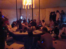 At night, several of us walked out onto the playa. We are breathless at the expanse of art work and "mutant vehicles," both of which are both far into the distance and close by. We see the "Burning Man" structure, a magnificent creation which will be burned at the end of the celebration. Photo. We turn around and look back towards the city and see an amazing spectrum of light: laser beams shooting into the night sky, cleverly designed, multi-colored vehicles, fire balls being shot out 50 feet into the air, and light of all colors emanating from the campsites of the 50,000 people here. It is amazing when one considers that this place is completely off the electrical grid!
